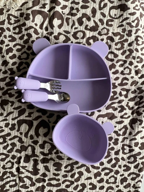 Набір дитячого силіконового посуду "Ведмедик" на присосках | Посуд для першого прикорму Фіолетовий