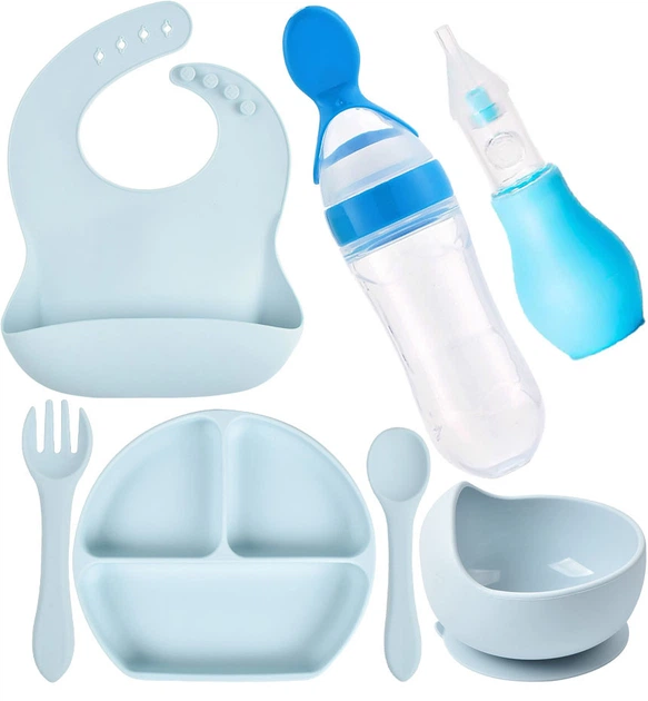 Набір Y5 синіконової тарілки, слиньчик, тарілка глибока, ложка, виделка, поріб з кришкою Голубий (n-9826)