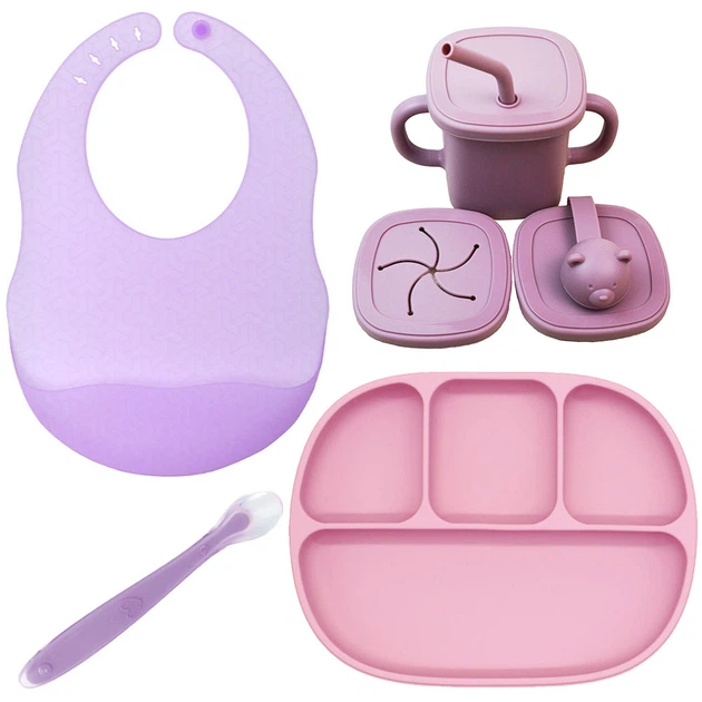 Набір силіконового посуду Y26 три-секційна тарілка поїльник ложка виделка слинявчик ніжно-фіолетовий (v-11003)
