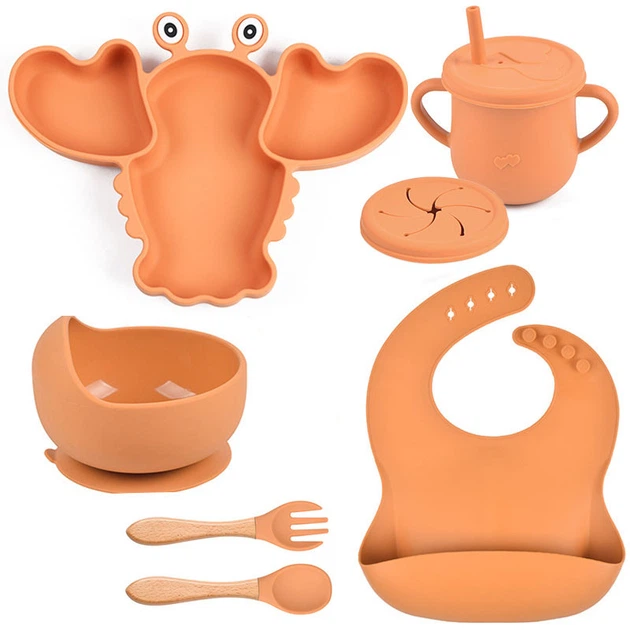 Набір силіконового посуду Y25 трьохсекційна тарілка Рак,поїльник,ложка виделка дерев'яні, слюнявчик Оранжевий n-11192