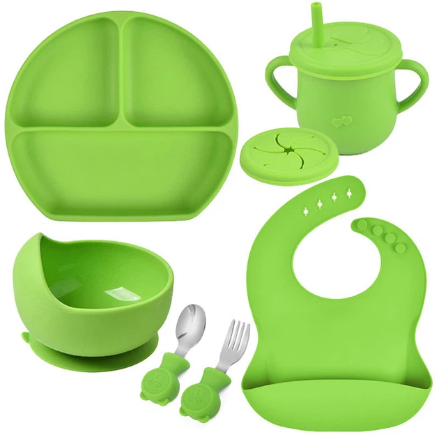 Набір силіконового посуду Y3 трьох-секційна тарілка, поїльник, ложка виделка, слюнявчик Зелений