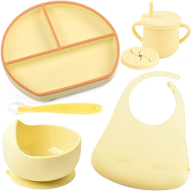 Набір дитячого силіконового посуду Y17 тарілка, слинявчик, тарілка для супу, ложка, вилка, поїльник
