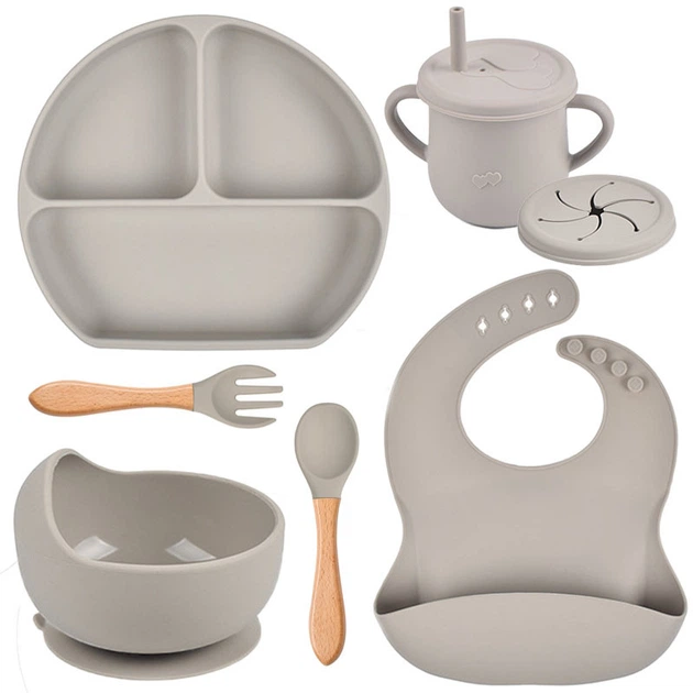 Набір силіконового посуду Y20 трьохсекційна тарілка, поїльник, ложка виделка дерев'яні, слюнявчик Сірий n-11148
