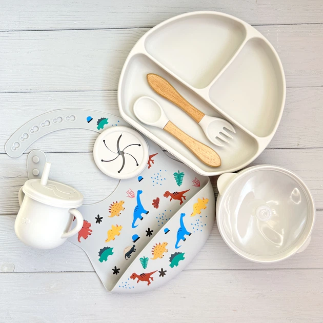 Чотирьох-секційна силіконова тарілка, прилади в кейсі, силіконовий слинявчик Сірий