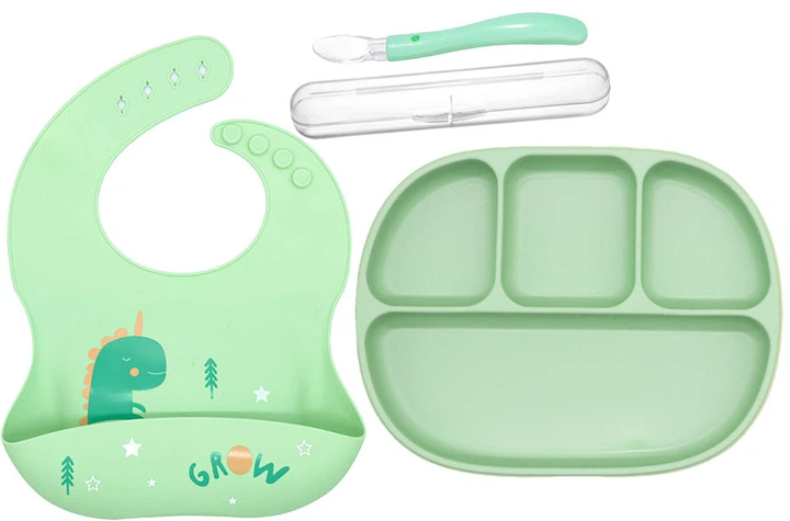 Чотирисекційна силіконова тарілка прилади в кейсі слюнявчик силіконовий 2Life 3 предмети Зелений (vol-10276)