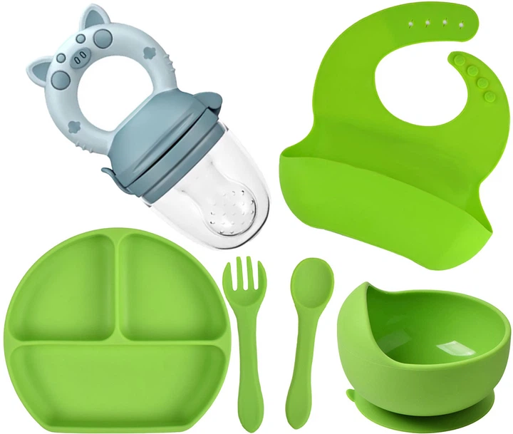 Набір силіконова тарілка слинявчик кругла тарілка для перших страв ложка вилка та ніблер 2Life Y7 5 шт Зелений (vol-9749)