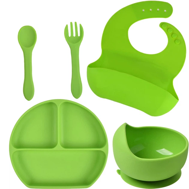 Набір силіконова тарілка слинявчик кругла тарілка для перших страв ложка вилка 2Life Y7 5 шт Зелений (vol-9748)