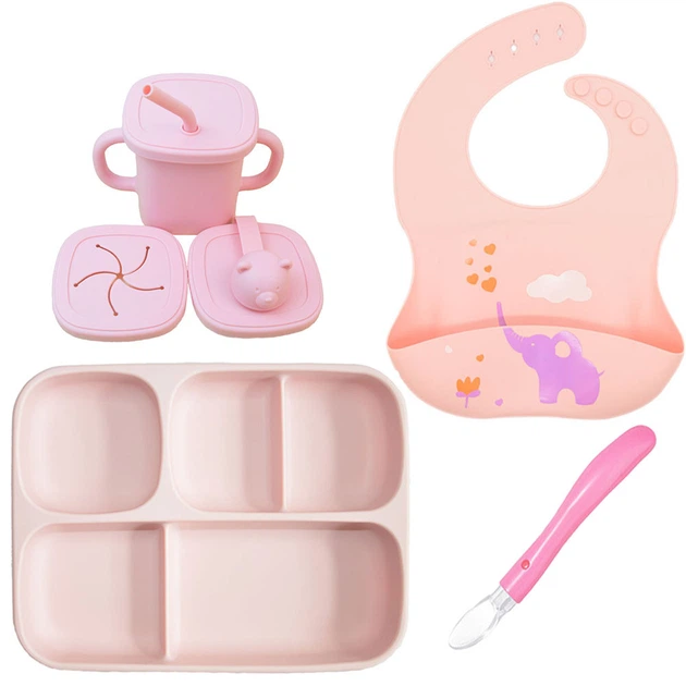 Чотирьох-секційна силіконова тарілка D15, ложка виделка, поїльник і слюнявчик Рожевий