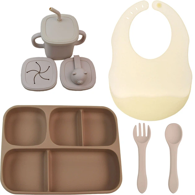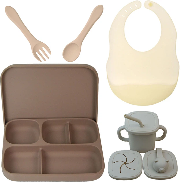 Набір дитячого силіконового посуду для годування ведмедики з нагрудником Космос 6 предметів Сірий світлий