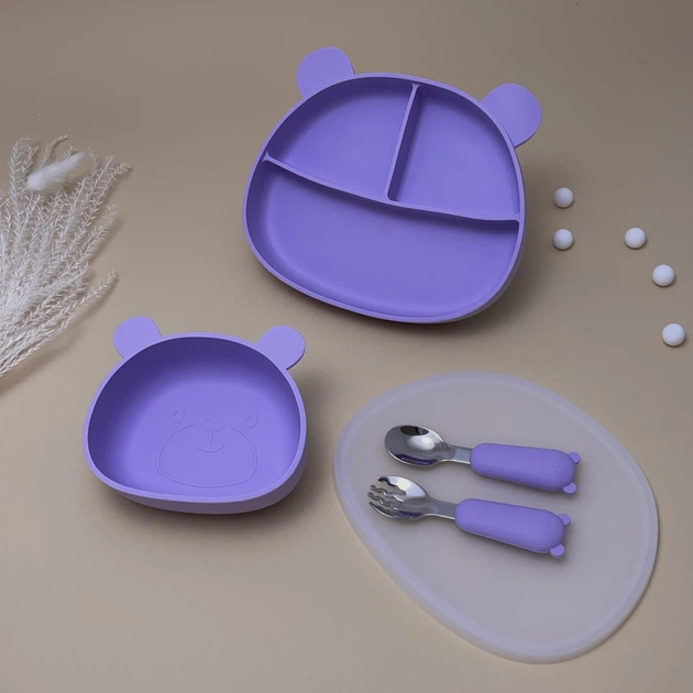 Набір посуду з харчового силікону на присосці для першого прикорму Ведмедик 5 шт. Лавандовий
