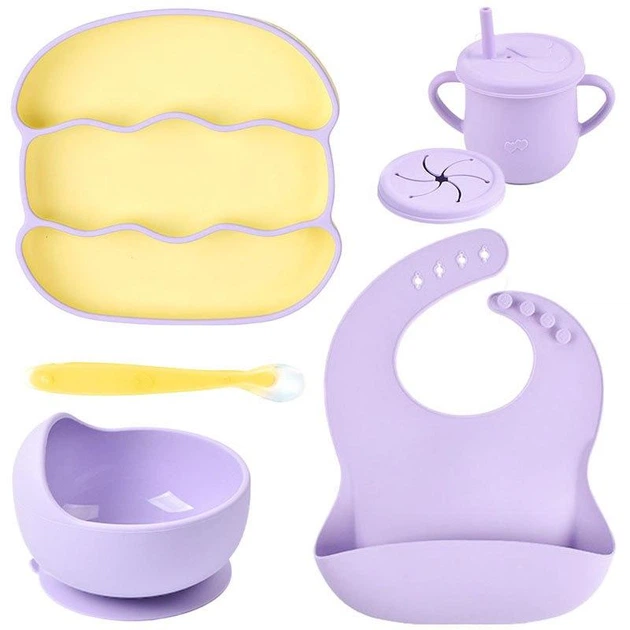 Набір дитячого силіконового посуду 2Life тарілки ложка поїльник з 2ма кришками слинявчик Фіолетовий v-12746