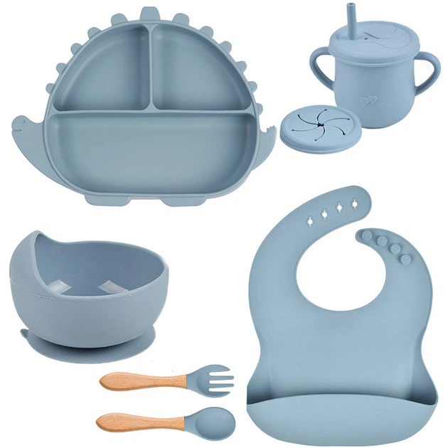 Набір силіконового посуду 2Life Y20 трьохсекційна тарілка Динозавр поїльник прибори слинявчик Сірий v-11220