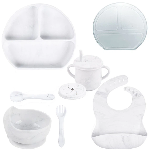 Набір силіконового посуду Y1 трьохсекційна тарілка з кришкою,поїльник,ложка виделка,слюнявчик Мрамор