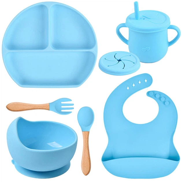 Набір силіконового посуду для прикорму для хлопчика 6 предметів Синій пудровий ВР103, нагрудник Звірі