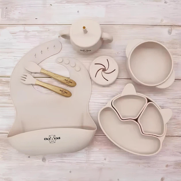 Набір силіконового дитячого посуду для прикорму на присосках із харчового силікону бежевий