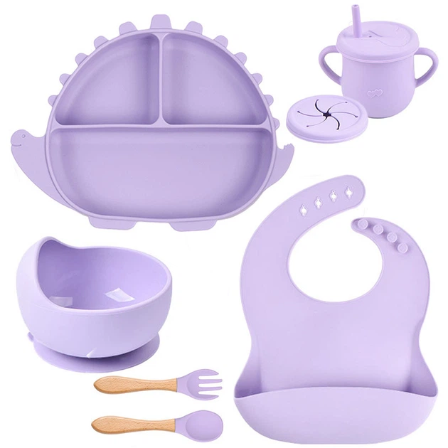 Набір силіконового посуду для прикорму для дівчинки 6 предметів колір Лаванда ВР 190, нагрудник принт Замок