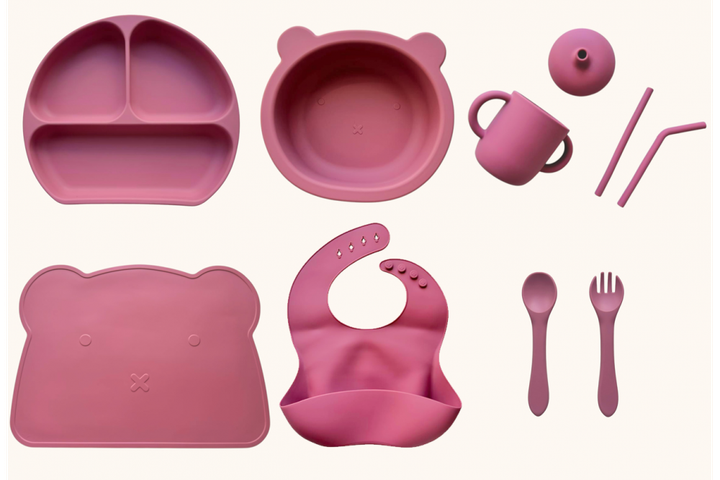 Набір дитячого силіконового посуду з котиком та нагрудником квіти 7 предметів Рожевий кварц