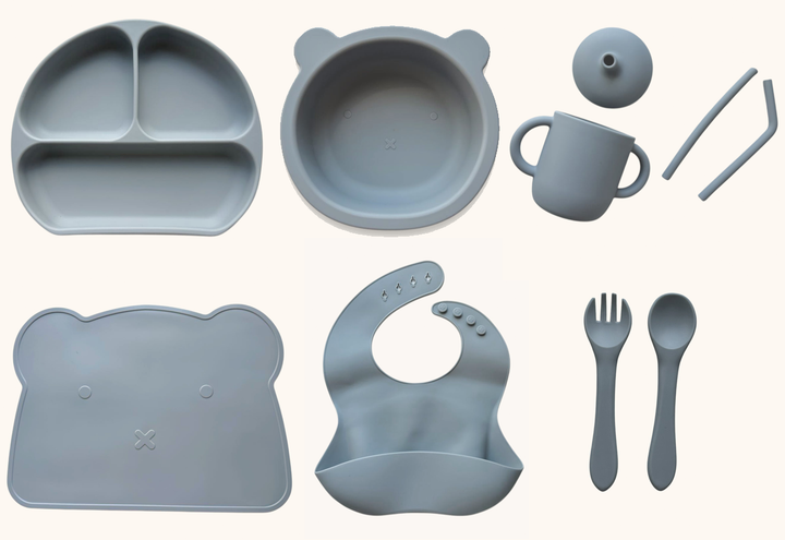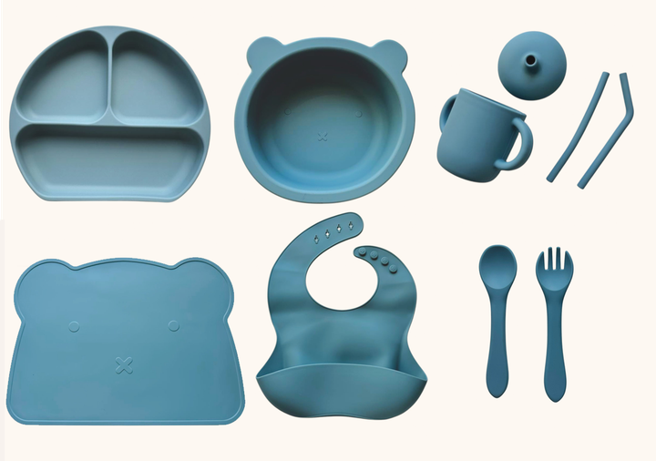 Набір дитячого силіконового посуду "Базовий з килимком. Ведмедик" Димний блакитний (2770383072)