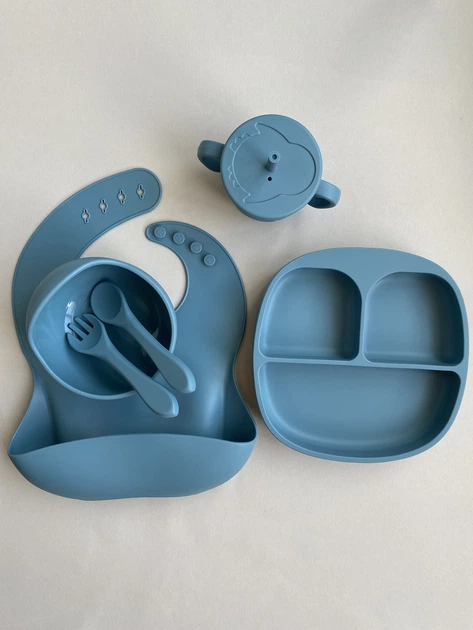 Дитячий набір посуду з силіконовими приборами синій димковий (B32)