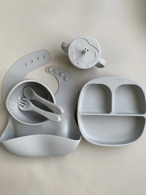 Дитячий набір посуду з силіконовими приборами світло сірий (B29)
