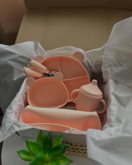 Дитячий силіконовий посуд для прикорму на присосках, набір дитячого посуду, нагрудник, секційний, глибокий Персиковий