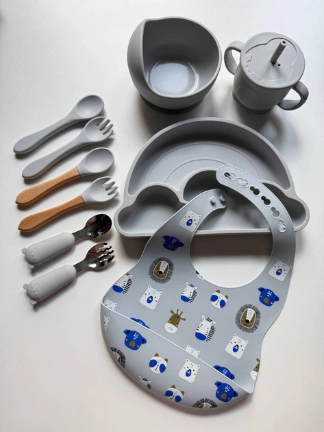 Силіконовий набір посуду для прикорму, подарунковий набір дитячого посуду, пакунок малюка Сірий