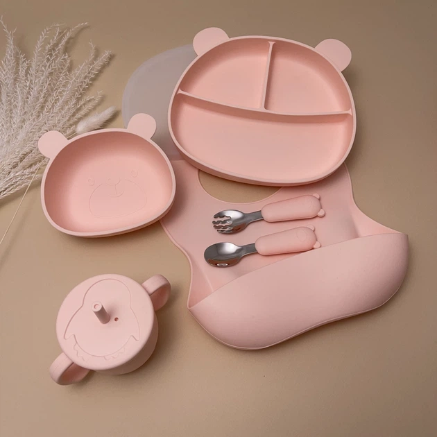 Подарунковий набір посуду з харчового силікону для першого прикорму, 7 шт. Рожевий