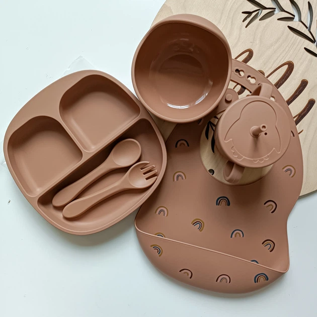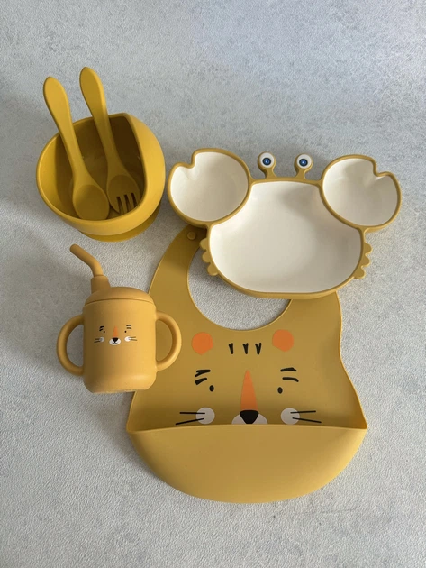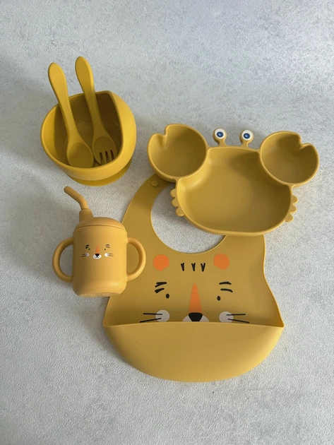 Набір силіконового посуду для дітей, 6 предметів, гірчичний колір, дитячий посуд на присосці