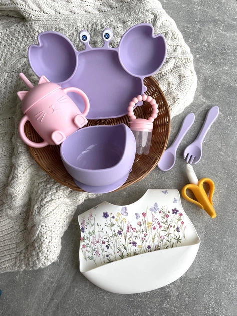 Набір дитячого силіконового посуду Крабик максі польові квіти лаванда