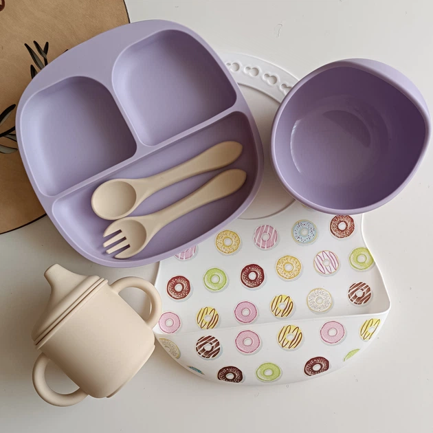 Дитячий силіконовий посуд для прикорму малюка, посуд для дівчинки на присосках Лаванда 6 од (0252)