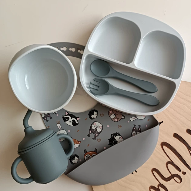 Набір посуду для прикорму дитини, посуд на присосках Сірий 6 од (0249)