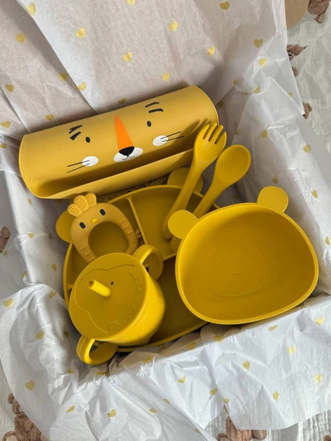Набір дитячого силіконового посуду на присосках | Посуд для першого прикорму Жовтий тигр