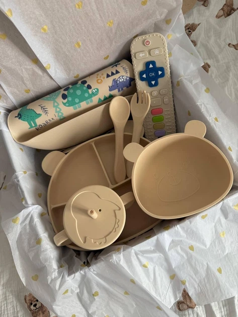 Набір дитячого силіконового посуду на присосках | Посуд для першого прикорму Динозаври бежеві
