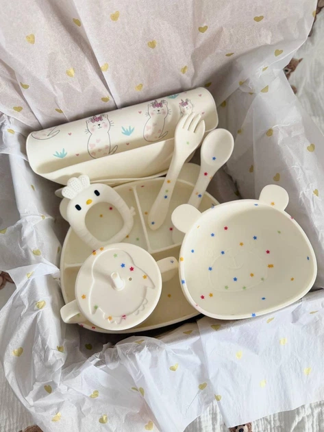 Набір дитячого силіконового посуду на присосках | Посуд для першого прикорму Білі котики