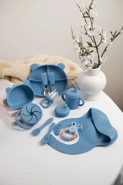 Великий набір силіконового посуду для дітей на присосках синій однотонний