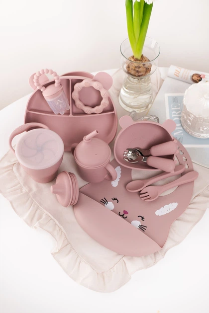 Великий набір силіконового посуду для дітей на присосках пудровий кролик