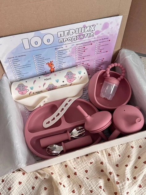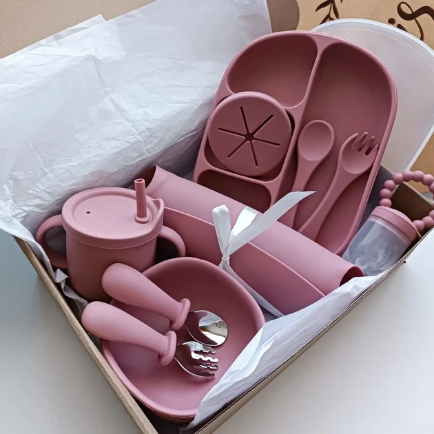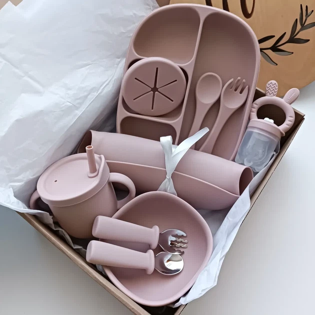 Набір посуду для малюка Пудра 10 шт Силіконовий посуд для дівчинки для прикорму (0318)