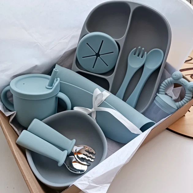 Набір посуду для малюка Блакитний та сірий 10 шт Екологічний посуд для дітей Дитячий посуд для прикорму (0333)