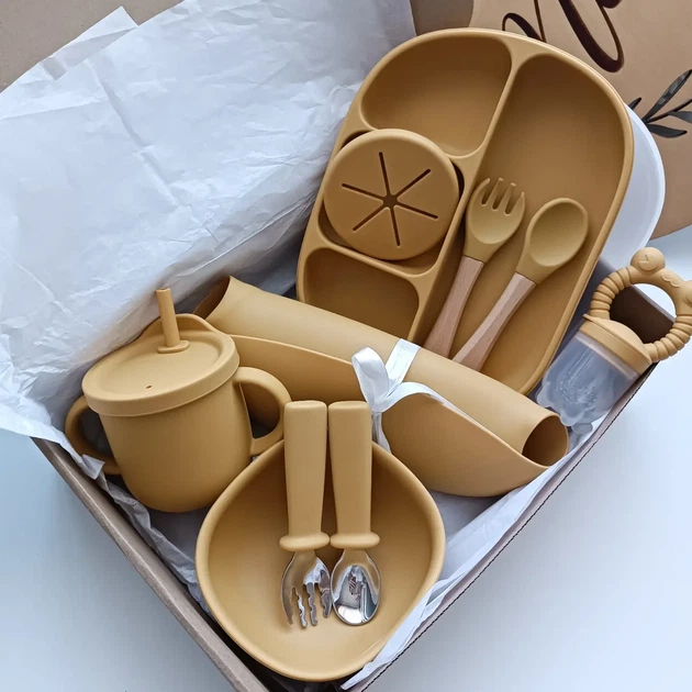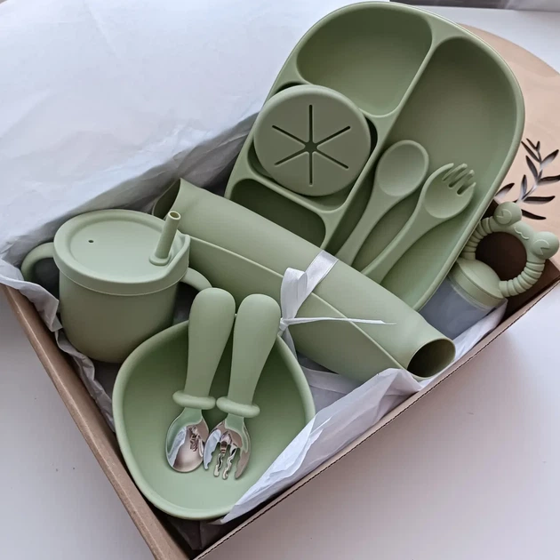 Набір посуду для малюка Оливка 10 шт Безпечний посуд для прикорму Посуд для малюків тарілка миска стакан (0336)
