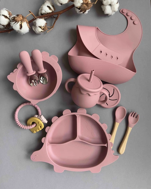 Набір посуду для малюка Діно Рожевий 10 шт Посуд для малюка із силікону Безпечний дитячий посуд (0007)