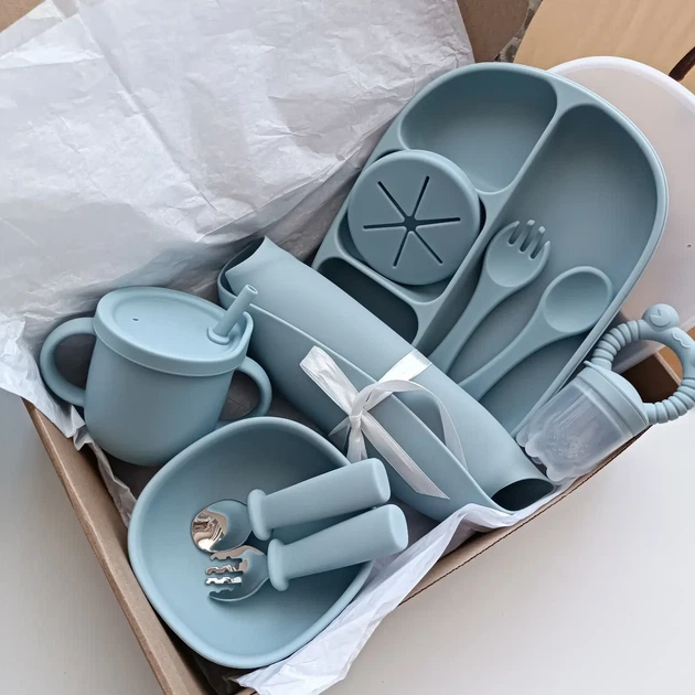 Набір силіконового посуду для годування дітей із 9 предметів з якісного, безпечного, харчового силікону Sea
