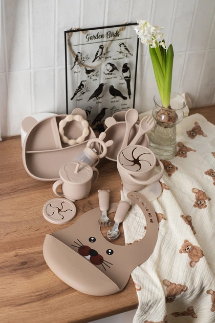 Великий набір силіконового посуду для дітей на присосках бежевий морський котик