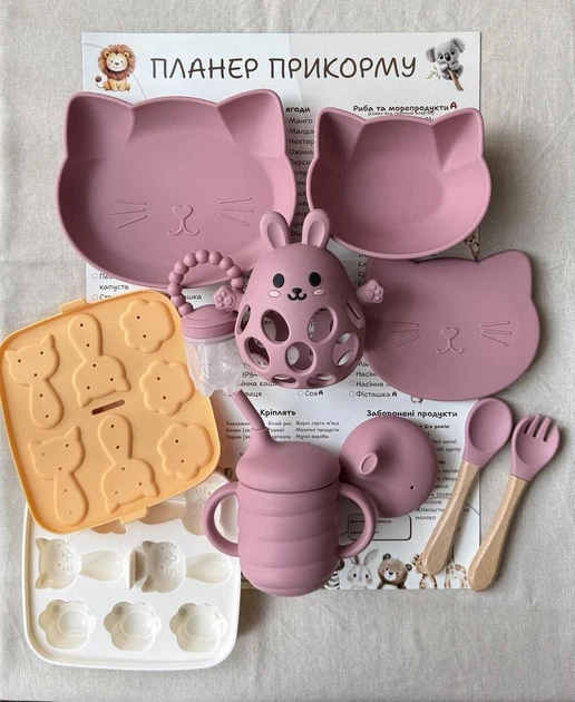 Набір посуду для малюка Веселка Пудра 11 шт Безпечний дитячий посуд Стильний посуд для прикорму (0014)
