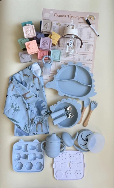 Набір дитячого силіконового посуду 12 позицій Дасті Блу та Сірий (0402)