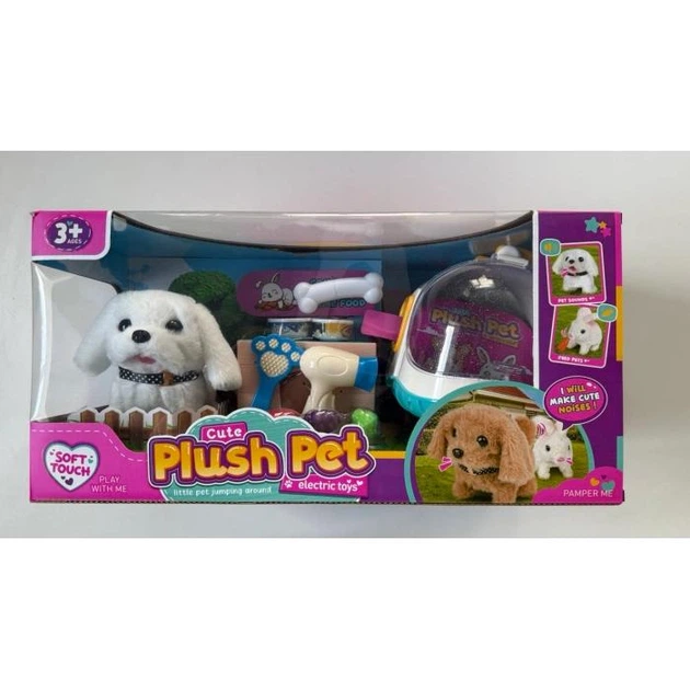 Інтерактивна іграшковка рухлива Собака Dog White 070, плюшева рухлива собачка з набором для догляду переноскою та звуковими