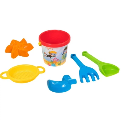 Набір пісочний 5 ТехноК арт. 0106 - цебро з динозаврами, лопатка, граблі, формочки та лійка для дітей від 1 року