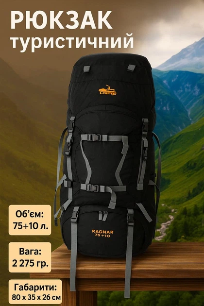 Рюкзак TravelCamp Ragnar 75+10 л, трекінговий, чорний, анатомічний пояс, питна система