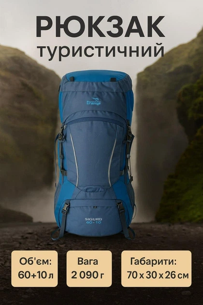 Рюкзак TravelCamp Sigurd 60+10 л, трекінговий, синій, легкий каркас, питна система