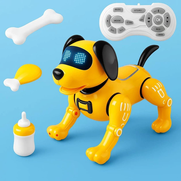 Собака робот на радіокеруванні з додатковими аксесуарами інтерактивна KOOQI іграшка трюкова яка програмується жовта зі звуко