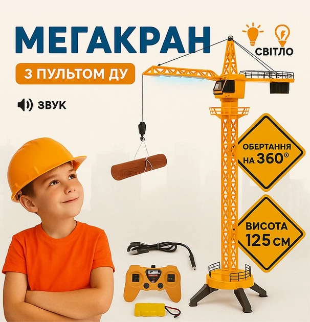 Іграшковий підйомний кран на радіокеруванні з пультом 125см, 360° обертання, світло, звук, акумулятор, дитячий будівельний к
